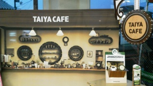 店内はタイヤカフェの飾り付けがされてます。温かいコーヒーでも飲みながら