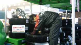 スタッフ中野君が待ってましたといわんばかりにホイールとタイヤのお掃除を